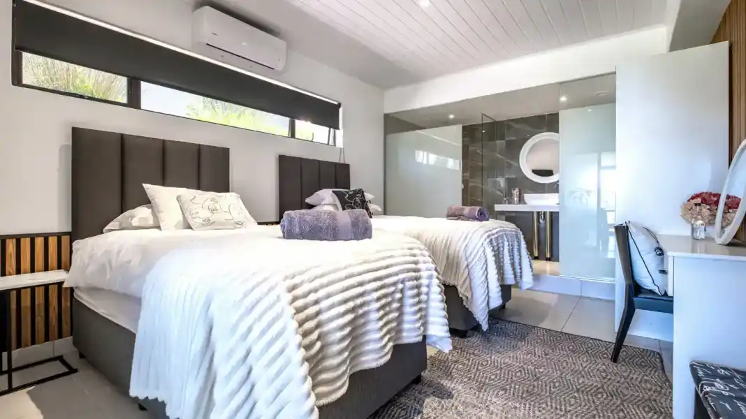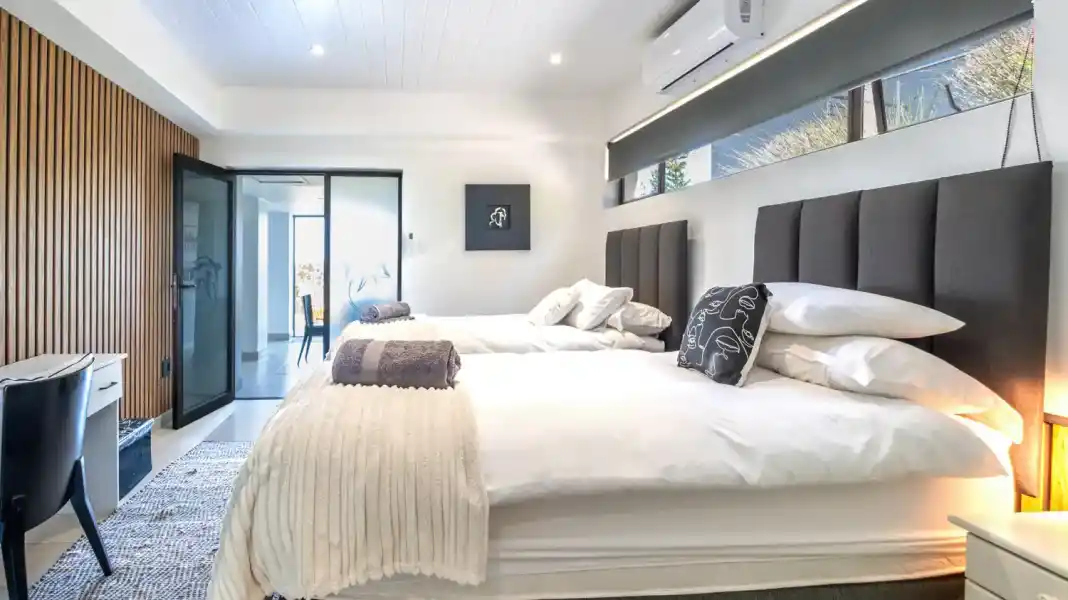 Guests can enjoy two separate living areas, both air-conditioned for year-round comfort. The main lounge includes a TV and an indoor braai — ideal for relaxed evenings. The second entertainment room features a pool table and an additional TV, creating the perfect space for fun and unwinding.