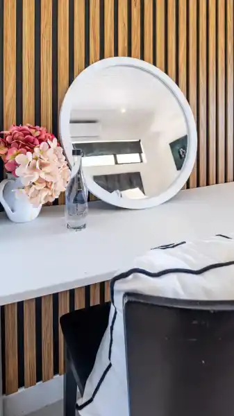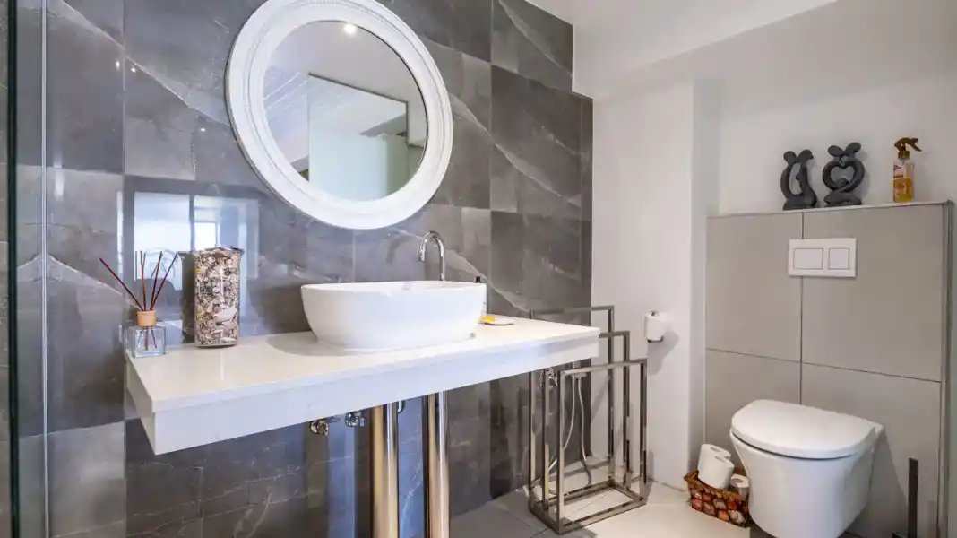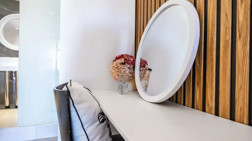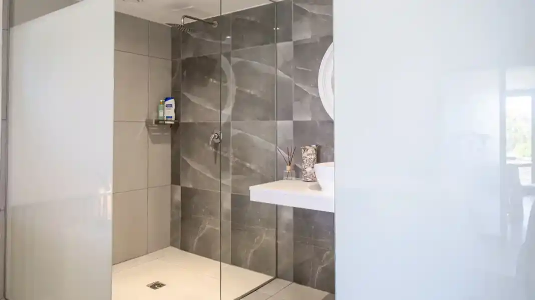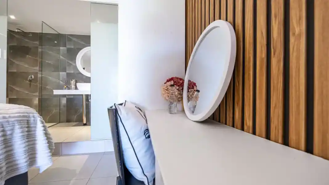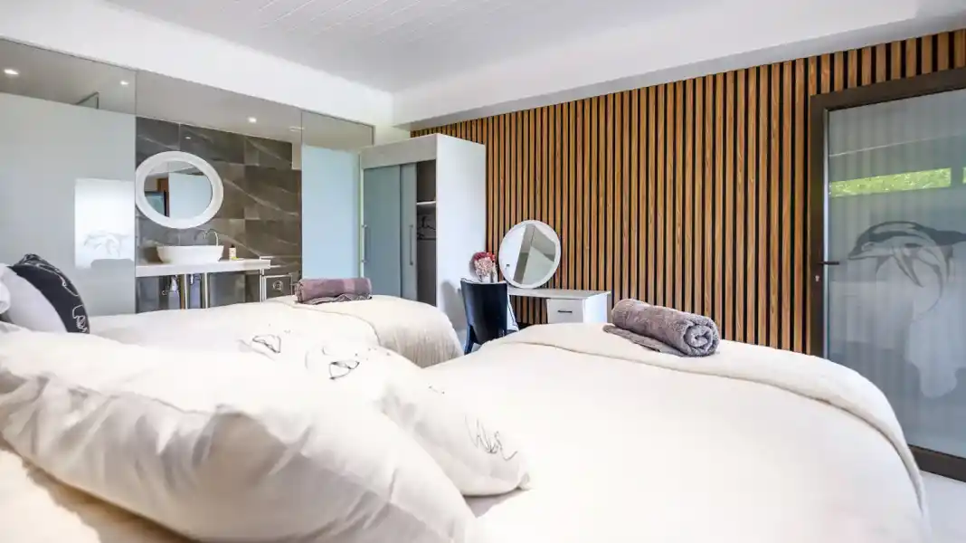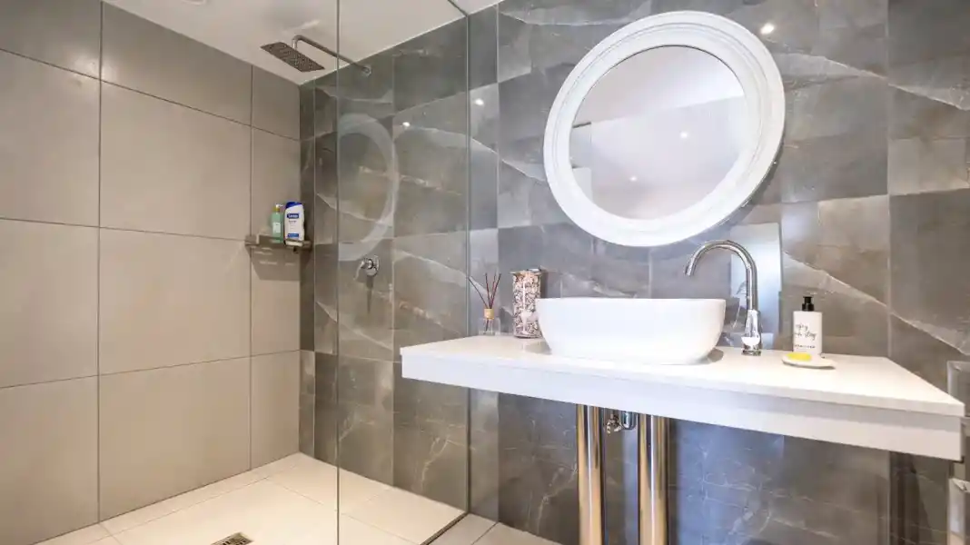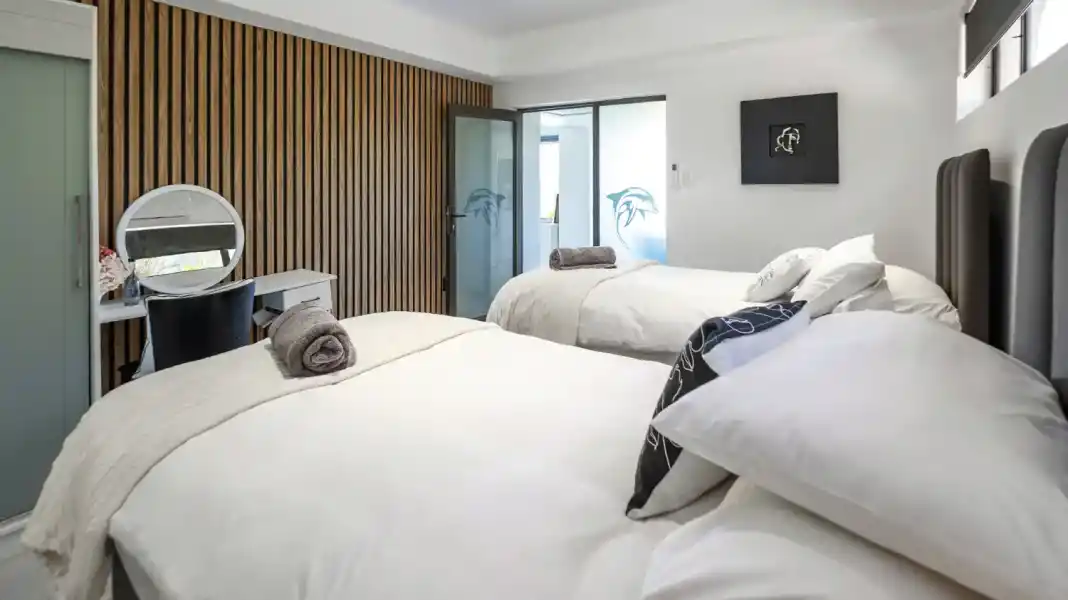 The apartment features two well-appointed bedrooms, each with its own en-suite bathroom. One bedroom offers a king-size bed, while the second bedroom is fitted with two single beds — perfect for a flexible sleeping arrangement.